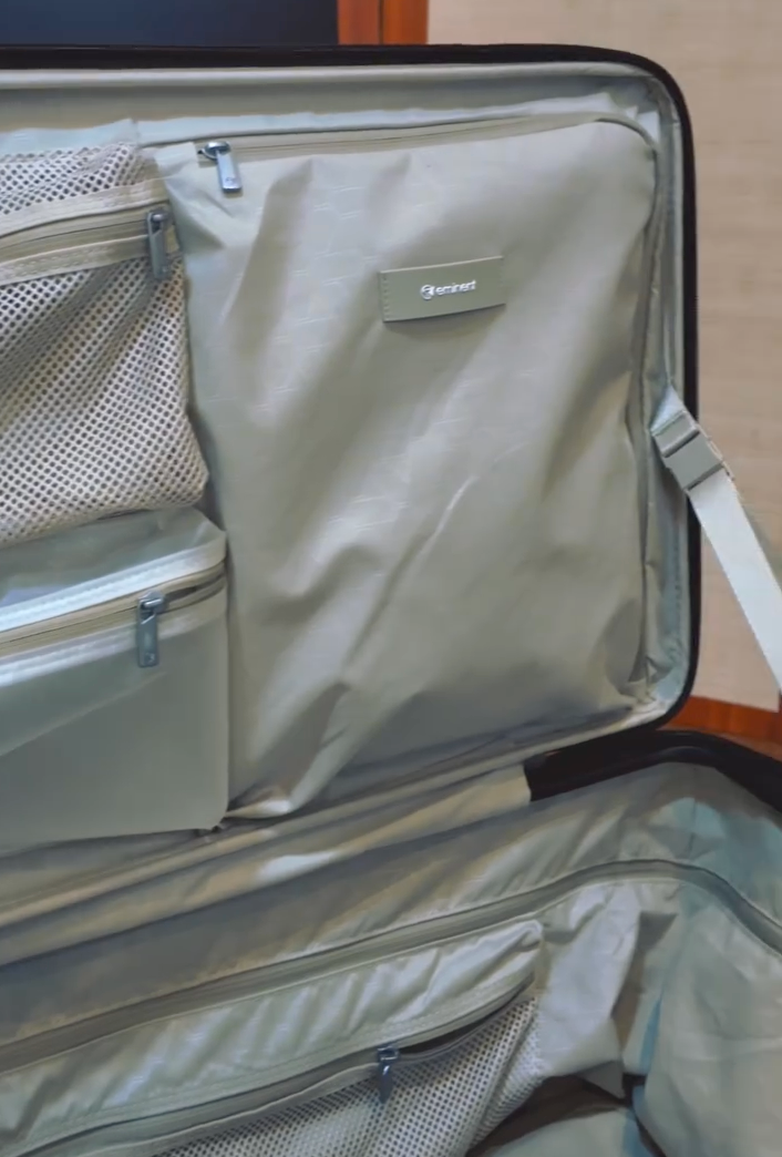 For starters, it enhances stability when paired with smooth Japanese Hinomoto wheels, which come with a built-in brake system that prevents the suitcase from rolling away on trains or uneven surfaces. And more importantly, the wider handle eliminates the internal grooves that take up extra space inside, typically caused by traditional double-rod handles. The result? A flatter interior that maximises packing space and makes organising a whole lot more seamless.