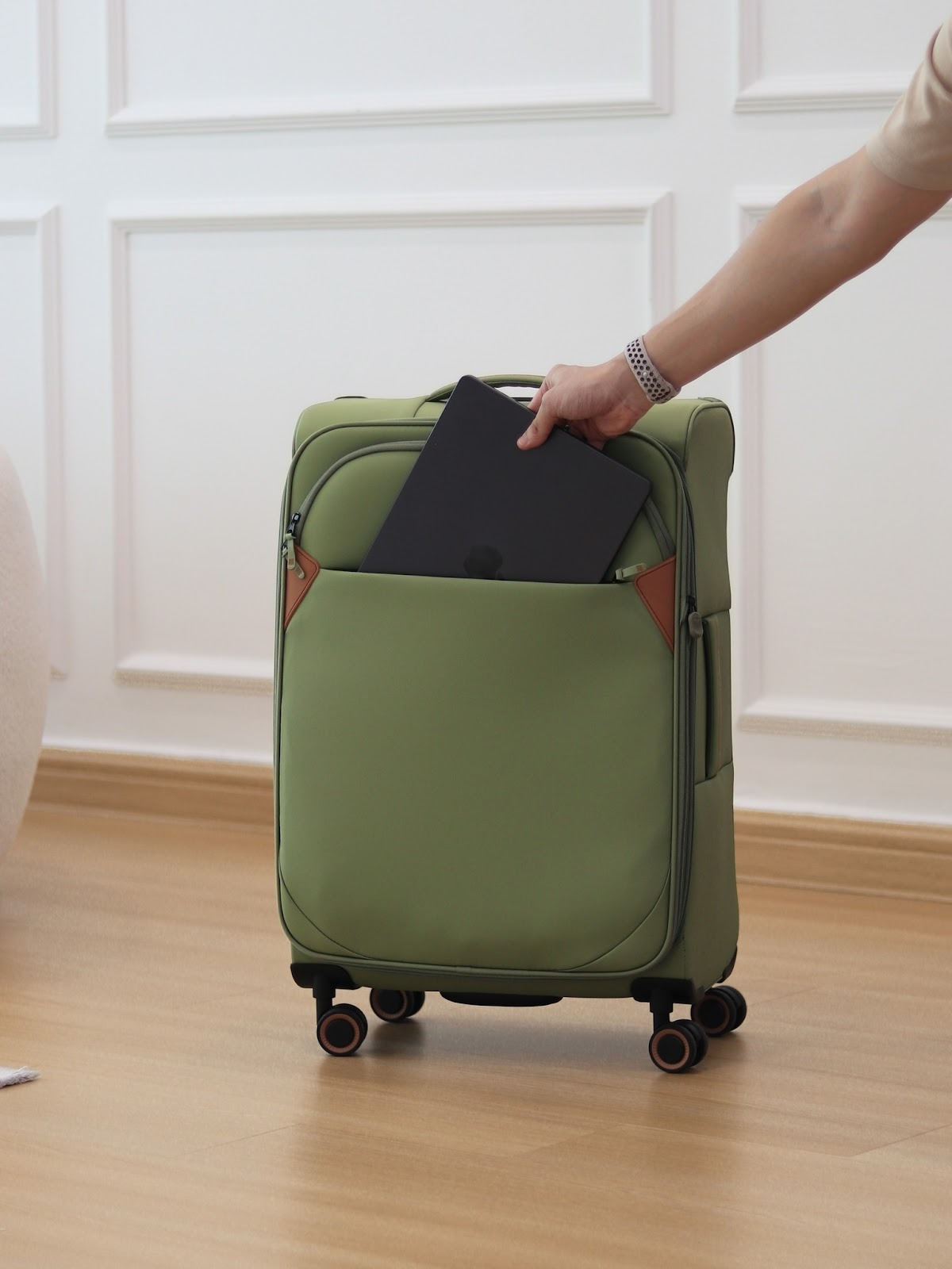 A soft-side suitcase is made from flexible materials such as polyester, nylon, or canvas. Unlike hard-shell luggage, which has a rigid construction, soft-side luggage offers a more adaptable structure, allowing you to squeeze it into tight spaces, expand when needed, and access your belongings more easily on the go.